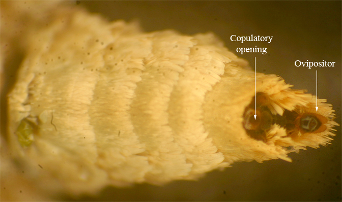 To give an idea of what the first look will be like, below are images of male (Fig. 3) versus female (Fig. 4) abdomens of Olethreutes sp., both presented in ventral view. In the male, the genitalia consist of a sclerotized ring with a pair of clasping valvae, one valve on either side. In; in Olethreutes, the structure of the valve is informative in species ID. In the female, at the very apex of the abdomen is an ovipositor, and anterad of this is the copulatory opening. In Olethreutes, the structures surrounding the copulatory opening are informative in species ID.